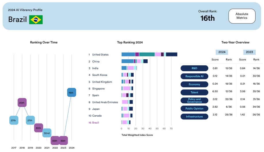 🇧🇷 O Brasil avançou significativamente em rankings globais de inteligência artificial, saltando de 35º para a 16ª colocação, impulsionado por melhorias em talento, ética e práticas de IA responsável, embora ainda haja lacunas em investimento, inovação e infraestrutura regulatória.