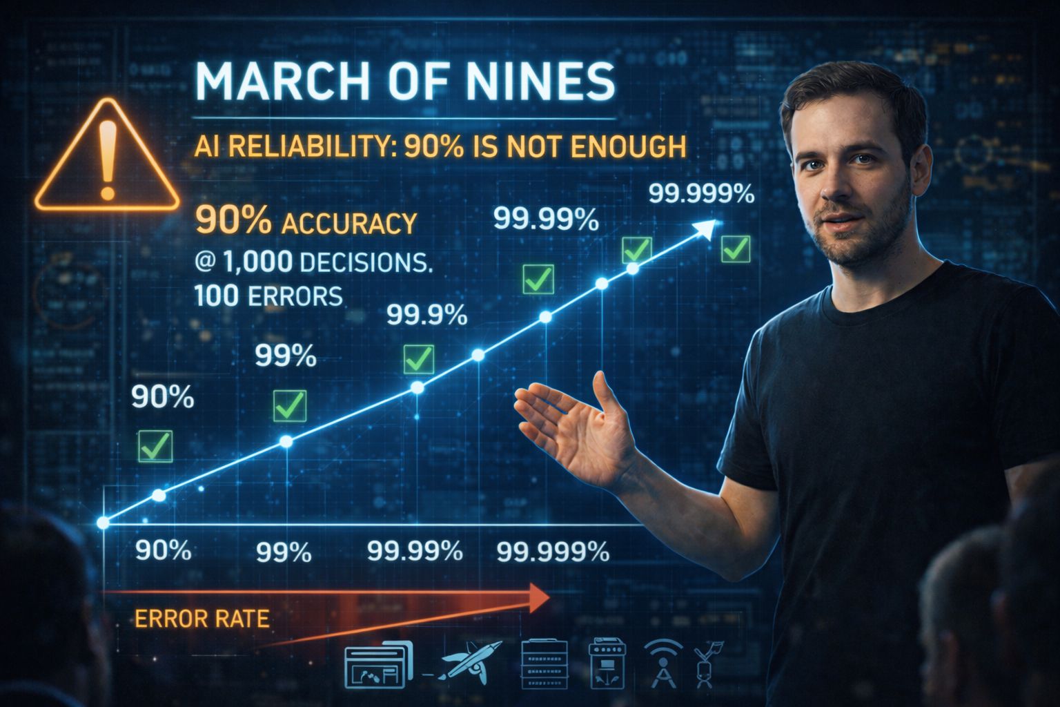 Ele usa a ideia da “march of nines” para ilustrar o problema. Em vez de 90% de confiabilidade, aplicações críticas exigem níveis como 99%, 99.9% ou até 99.999%. Cada novo “nove” representa uma ordem de magnitude menor de falhas, algo essencial para sistemas usados em infraestrutura, software corporativo ou automação.